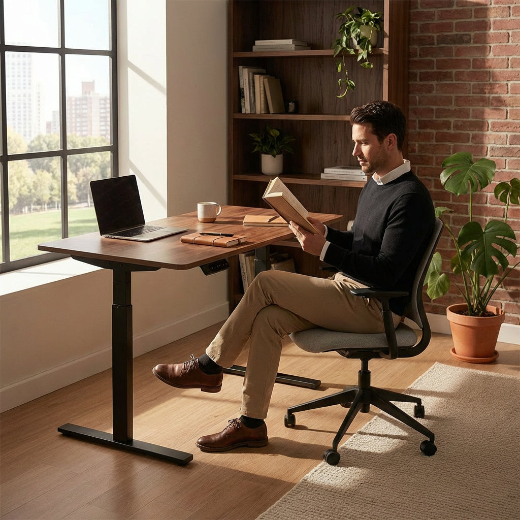 Cambiar de posición durante la jornada, reduce la presión en la zona lumbar y cervical. Menos molestias, menos tensión, más foco.